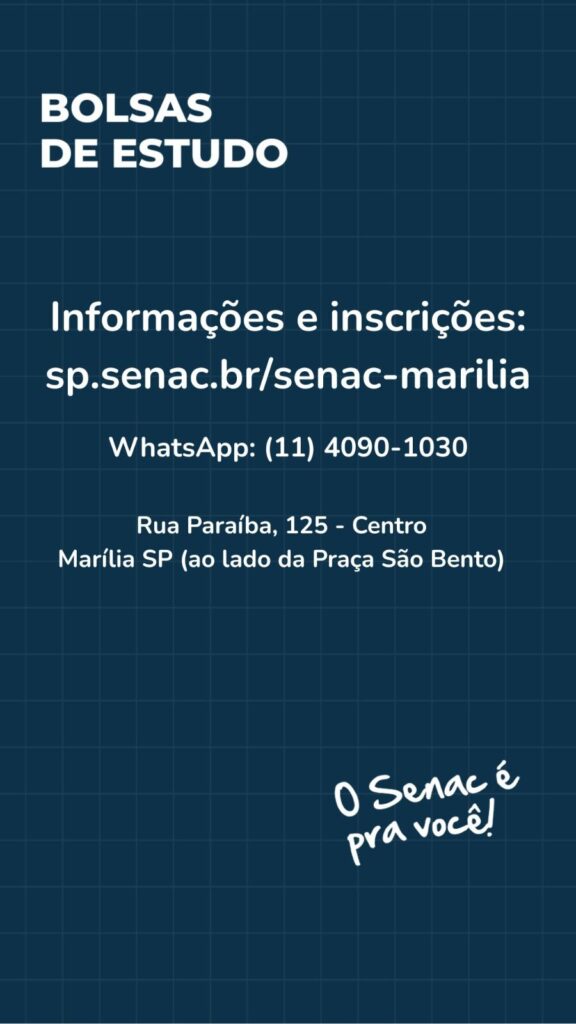 As inscrições, datas e horários dos cursos poderão ser verificados pelo site: https://www.sp.senac.br/senac-marilia. Em caso de dúvidas, o WhatsApp é (11) 4090-1030, o telefone é (14) 3311-7700, e o e-mail: [email protected]. O Senac Marília fica na rua Paraíba, 125 – ao lado da Igreja São Bento.