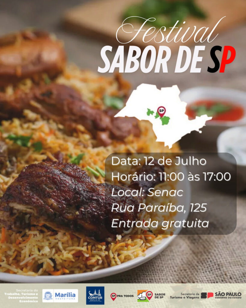 O Senac Marília sedia, nos dias 11 e 12 de julho, a etapa regional do Festival Gastronômico Sabor de São Paulo, iniciativa que valoriza a gastronomia como um dos principais motores do turismo no estado. O evento, promovido pela Secretaria de Turismo e Viagens do Estado de São Paulo (Setur-SP), em parceria com o núcleo de inteligência em gastronomia Mundo Mesa e o Senac São Paulo, terá programação fechada para convidados e profissionais do setor na sexta-feira e, no sábado, será aberto ao público com entrada gratuita.