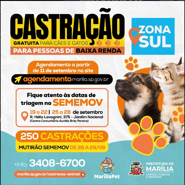 Estão abertas as inscrições para a triagem, que será realizada entre os dias 19 e 22 e entre 25 e 28 de setembro no SEMEMOV (Serviço Médico Veterinário Móvel) para castração gratuita de cães e gatos de pessoas de baixa renda, na zona Sul, de Marília.