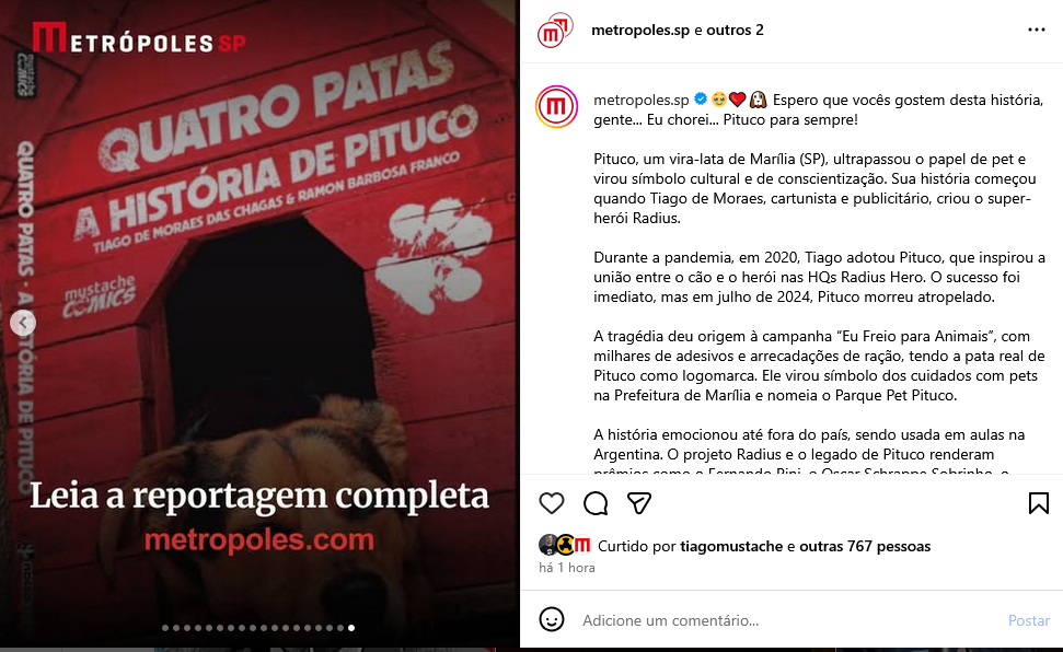 “Um animal de estimação é, quase sempre, encarado como um membro da família. No caso de Pituco, vira-lata natural de Marília, no interior de São Paulo, o reconhecimento ultrapassou o seio familiar: ele se tornou personagem literário, além de uma personalidade admirada pelo município e até mesmo fora do país”, noticiou o Metrópoles, no último domingo, dia 2 de novembro de 2025. Atualmente, o site é um dos mais acessados em todo o Brasil, com grande repercussão também no Instagram.