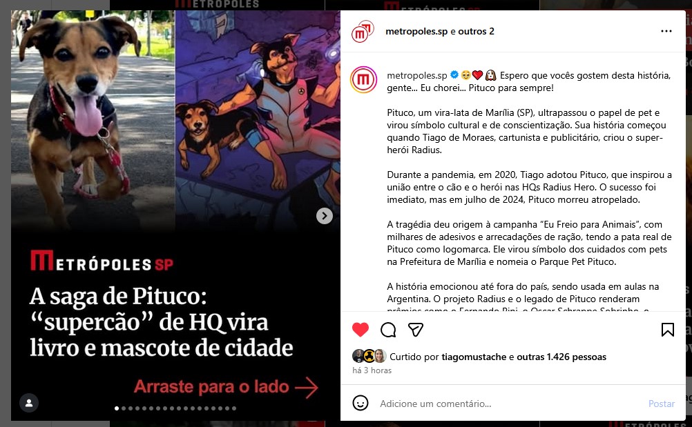 Aliás, o post com a reportagem sobre Pituco recebeu até o começo da tarde desta segunda-feira, dia 3 de novembro, mais de 1.400 curtidas. A matéria especial conta que o vira-latinha – que morreu vítima de atropelamento em julho de 2024 – agora tem um legado que vai desde a campanha por um trânsito mais seguro à campanha de posse responsável e arrecadação de rações para animais abandonados.