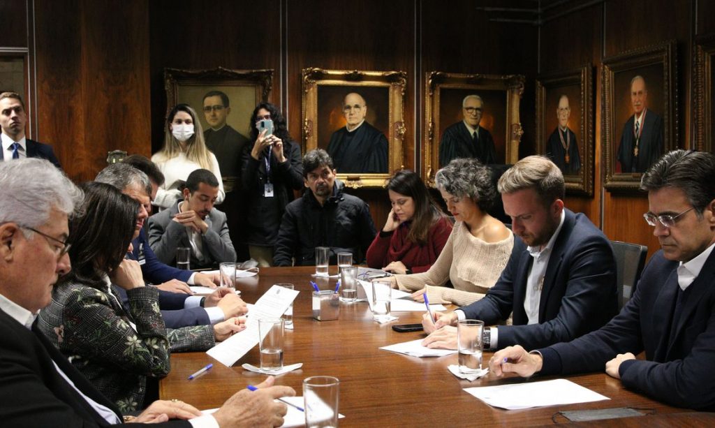 O presidente do Tribunal Regional Eleitoral de São Paulo (TRE-SP), desembargador Paulo Galizia, recebeu na manhã de hoje (19) representantes de partidos políticos e candidatos ao governo do estado de São Paulo, convidados a firmarem o Compromisso pela Democracia, para redução dos efeitos nocivos da disseminação de desinformação que atente contra a democracia e a Justiça Eleitoral.
